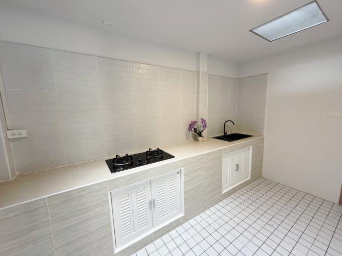 รีโนเวทแบบจัดเต็ม ทำระแนงโรงจอดรถ ปูกระเบื้องให้ใหม่หมดทั้งหลัง ต่อเติมครัวพร้อมเคาน์เตอร์ครัว ครัวกว้างมากๆ